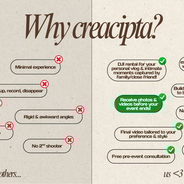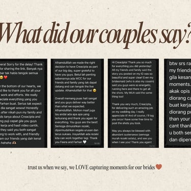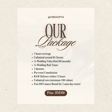 Kami di Creacipta membantu pasangan pengantin merakam detik bahagia mereka dalam gaya yang natural, spontan, dan penuh emosi sebenar β supaya selepas majlis, anda boleh terus mengimbau setiap kenangan tanpa stres fikir pasal upload atau edit!