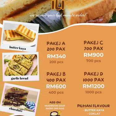 Paling best, kami terima tempahan saat akhir! Jadi kalau tiba-tiba ada majlis atau jamuan, jangan risau β Roti Bakar Ili sedia bantu anda.